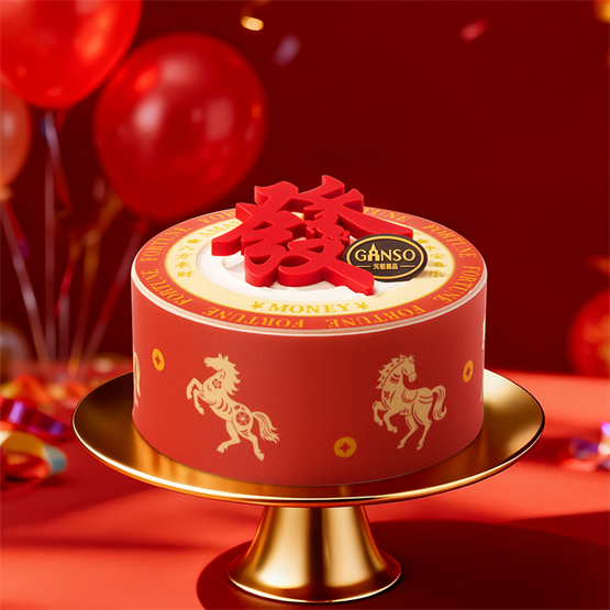 元祖“马上发”蛋糕的整体设计洋溢着浓郁的中国年味与喜庆氛围。蛋糕通体以热烈而吉祥的红色为主调,象征着红红火火的新年开端。蛋糕顶部,一个醒目的、可食用的红色“发”字赫然在目,直接点明了“马上发”的核心祝福,寓意财源广进、事业发达。